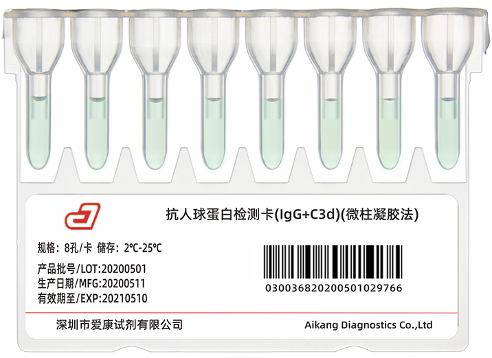 采用微柱凝胶法,8孔卡设计,用于直接抗人球蛋白试验和间接抗人球蛋白试验,主要用于不规则抗体筛查、交叉配血、抗体致敏红细胞的检测(新生儿溶血病)等